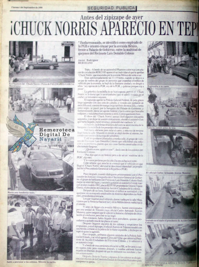 Ulises Castrejón M./Hemeroteca Digital de Nayarit. — Los habitantes de la capital nayarita pensaron que el mismísimo Chuck Norris había dejado Texas para venir a impartir justicia (o patadas giratorias) a las tierras coras. Pero no, no se emocionen. No era la estrella de Hollywood, sino un espécimen local con mucho estilo, un Phantom rojo y una placa que, según él, le daba permiso de pasar por encima de la mismísima ley de gravedad… o al menos por encima de una manifestación.